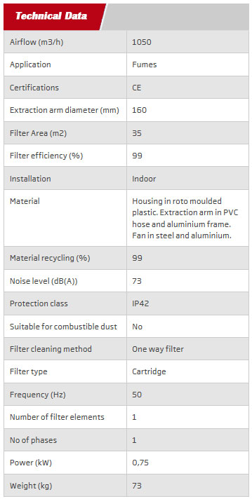 Mobile filter unit for light welding and extraction applications. Includes Extraction Arm Original with an integrated spotlight, which optimizes the user-friendly design. If a larger working range is needed, the 3 m (10 ft.) long arm is recommended.